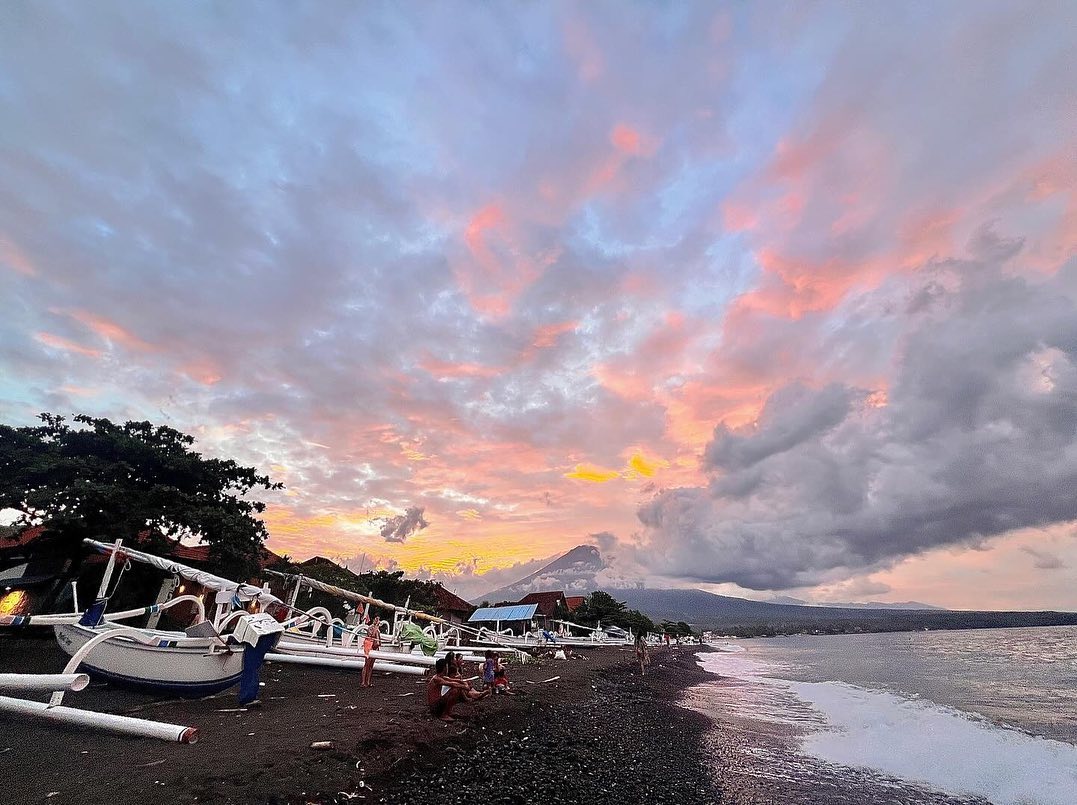 Amed Beach, stretching along the northeastern coast of Bali, is a world away from the island’s bustling tourist hubs. Characterized by its unique black volcanic sand, the beach offers a dramatic contrast to the azure waters of the Bali Sea.